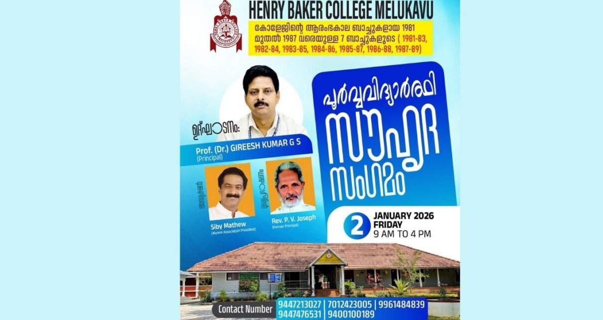 മേലുകാവ്: മേലുകാവ് ഹെൻട്രി ബേക്കർ കോളേജിൽ 2026 ജനുവരി മാസം രണ്ടാം തീയതി വെള്ളിയാഴ്ച രാവിലെ 9.30 മുതൽ ഉച്ചകഴിഞ്ഞ് 4 മണിവരെ മെഗാ പൂർവ്വ വിദ്യാർത്ഥി സംഗമവും മരണമടഞ്ഞവരെ അനുസ്മരിക്കലും കോളേജിൻറ തുടക്കം മുതലുള്ള ഏഴു ബാച്ചുകളുടെ മെഗാ പൂർവ്വ വിദ്യാർത്ഥി സംഗമമാണ് നടക്കുന്നത്. 1981-83, 1982- 84, 1983-85,1984-86, 1985-87,1986-88,1987-89 എന്നീ ഏഴു ബാച്ചുകളുടെ പൂർവ്വ വിദ്യാർത്ഥി സംഗമവും മരണമടഞ്ഞവരെ അനുസ്മരിക്കലുമാണ് നടക്കുന്നത്. പരിപാടിയുടെ ഉദ്ഘാടനം 2026 ജനുവരി മാസം രണ്ടാം തീയതി വെള്ളിയാഴ്ച Read More…