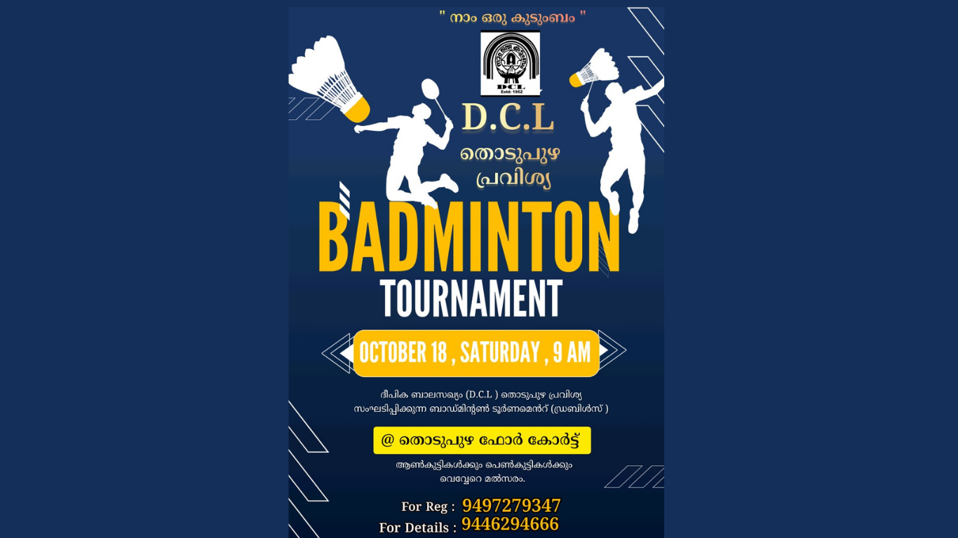 തൊടുപുഴ : ഡി.സി.എൽ സംഘടിപ്പിക്കുന്ന സംസ്ഥാന ബാഡ്മിന്റൺ ടൂർണമെന്റിന്റെ (ഡബിൾസ്) തൊടുപുഴ പ്രവിശ്യാതല മത്സരം ഒക്ടോബർ 18 ശനിയാഴ്ച രാവിലെ 9 മുതൽ തൊടുപുഴ ബാഡ്മിൻറൺ ഫോർ കോർട്ടിൽ നടക്കും.