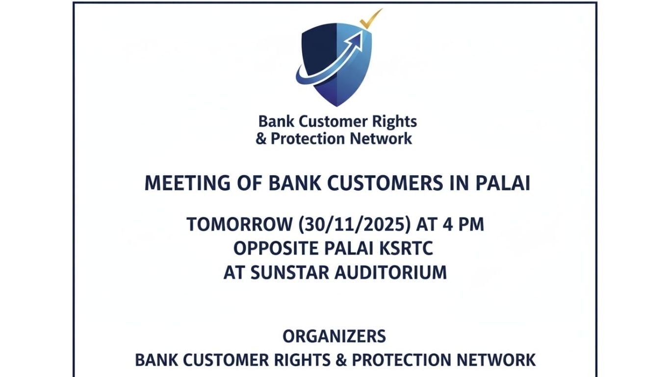 പാലായിലെ ബാങ്ക് ഉപഭോക്താക്കളുടെ യോഗം ഇന്ന് (30/11/2025) വൈകിട്ട് നാലിന് കെ എസ് ആർ ടി സി യ്ക്ക് എതിർവശത്തുള്ള സൺസ്റ്റാർ ഓഡിറ്റോറിയത്തിൽ ചേരും.