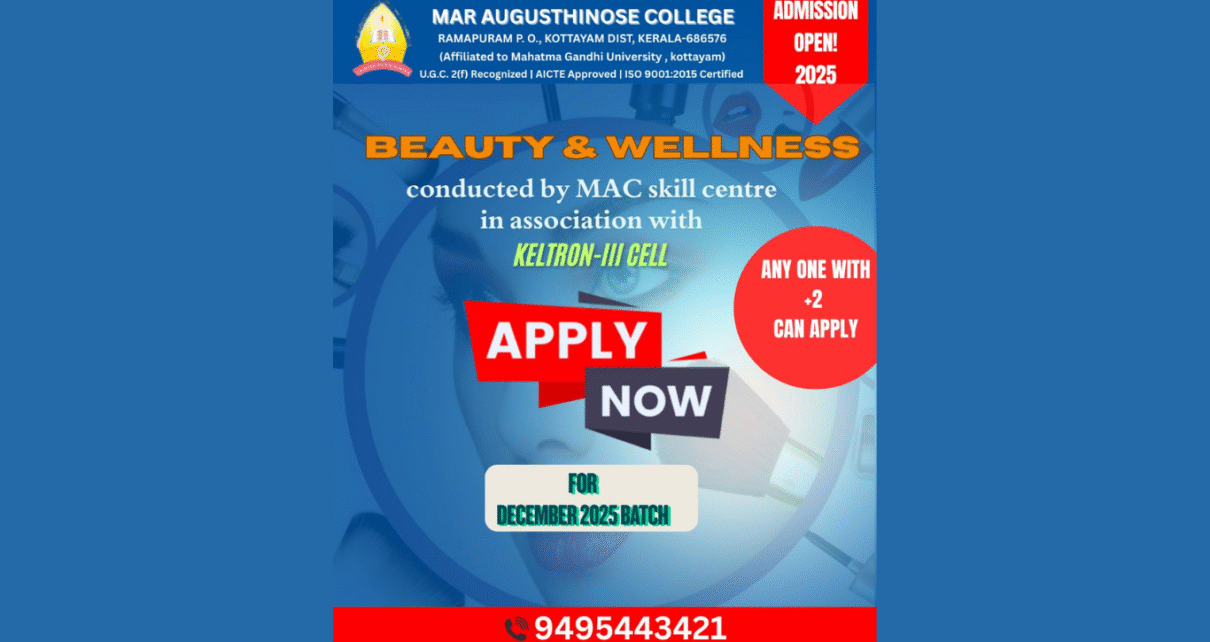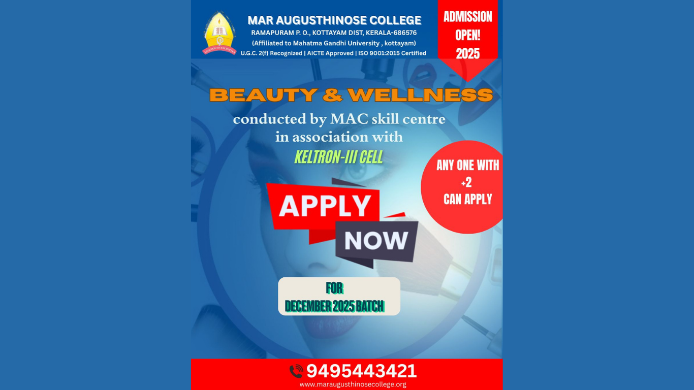 രാമപുരം: മാർ ആഗസ്തിനോസ് കോളേജ് സ്കിൽ ഡെവലപ്പ്മെന്റ് സെന്ററിന്റെ ആഭിമുഖ്യത്തിൽ കെൽട്രോണിന്റെ സഹകരണത്തോടെ ഡിസംബറിൽ ആരംഭിക്കുന്ന ബ്യൂട്ടി ആന്റ് വെൽനെസ് കോഴ്സിലേക്ക് പ്രവേശനം ആരംഭിച്ചിരിക്കുന്നു.