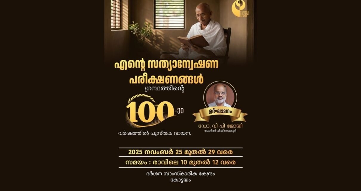 കോട്ടയം: മഹാത്മാ ഗാന്ധിയുടെ വിശ്വപ്രസിദ്ധമായ ആത്മകഥ ‘എന്റെ സത്യാന്വേഷണ പരീക്ഷണങ്ങൾ’ എന്ന ഗ്രന്ഥത്തിന്റെ നൂറാം വാർഷികത്തോടനുബന്ധിച്ച് കോട്ടയം ദർശന സാംസ്കാരിക കേന്ദ്രം പുസ്തക പാരായണം സംഘടിപ്പിക്കുന്നു.