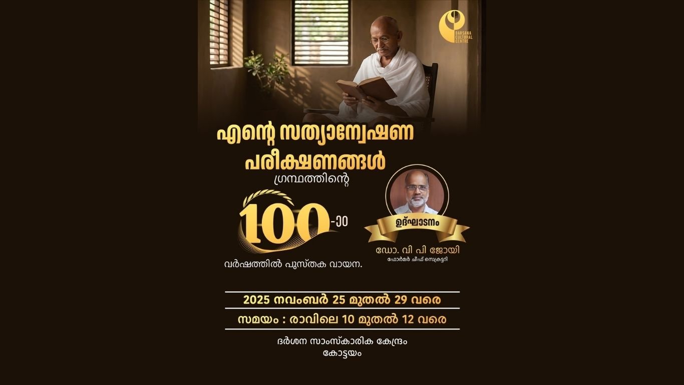 കോട്ടയം: മഹാത്മാ ഗാന്ധിയുടെ വിശ്വപ്രസിദ്ധമായ ആത്മകഥ ‘എന്റെ സത്യാന്വേഷണ പരീക്ഷണങ്ങൾ’ എന്ന ഗ്രന്ഥത്തിന്റെ നൂറാം വാർഷികത്തോടനുബന്ധിച്ച് കോട്ടയം ദർശന സാംസ്കാരിക കേന്ദ്രം പുസ്തക പാരായണം സംഘടിപ്പിക്കുന്നു.