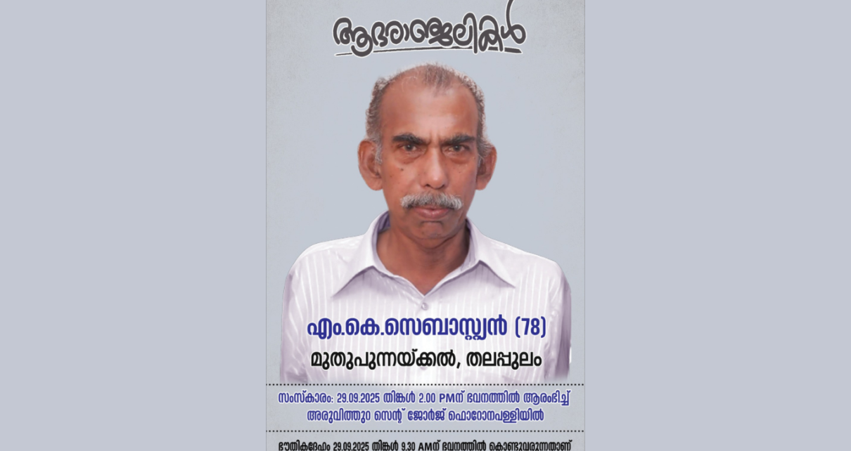 തലപ്പലം : മുതുപുന്നക്കൽ എം.കെ. സെബാസ്റ്റ്യൻ (78) നിര്യാതനായി. ഭൗതികശരീരം നാളെ, (29.09.2025) രാവിലെ 9 ന് സ്വവസതിയിൽ കൊണ്ടുവരുന്നതും മൃതസംസ്കാര ശുശ്രൂഷകൾ ഉച്ചകഴിഞ്ഞ് 2 ന് ഭവനത്തിൽ ആരംഭിച്ച് അരുവിത്തുറ സെന്റ് ജോർജ് ഫൊറോനാ പള്ളിയിൽ സംസ്കരിക്കുന്നതാണ്.