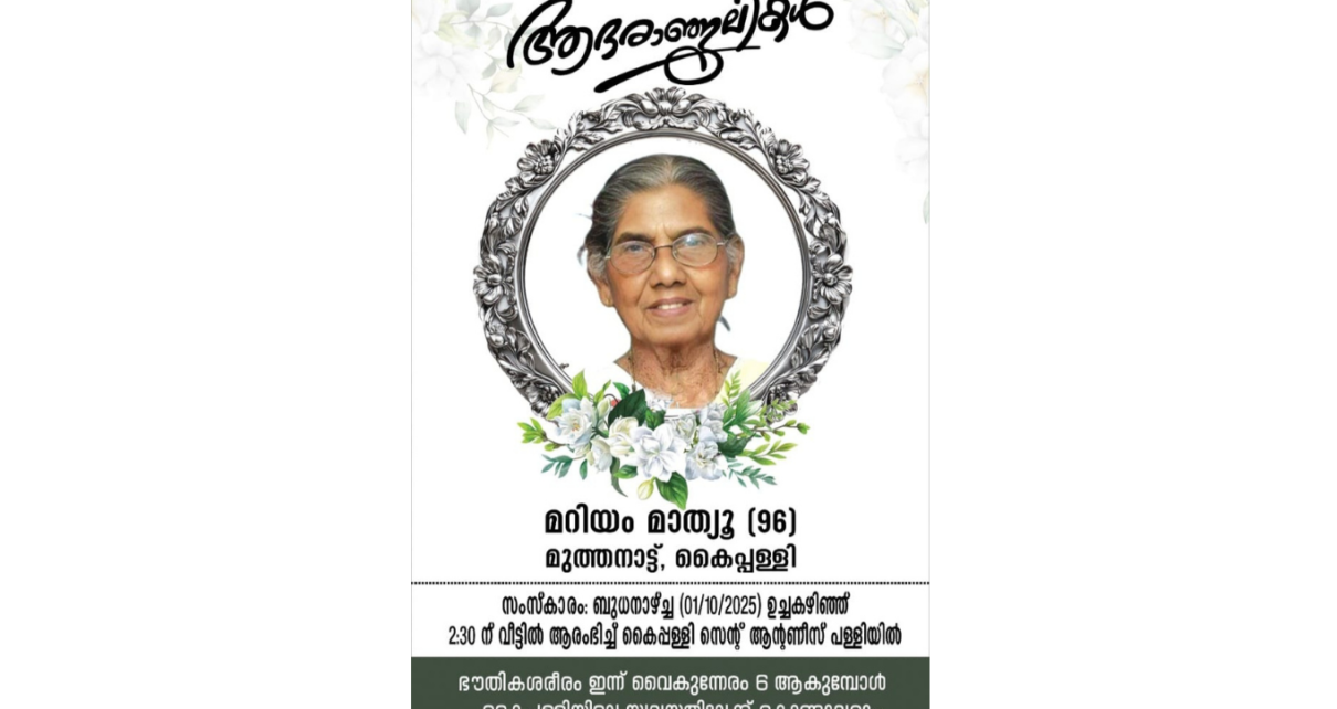 കൈപ്പള്ളി : മുത്തനാട്ട് മറിയം മാത്യു (96) നിര്യാതയായി. സംസ്കാരം നാളെ (ബുധനാഴ്ച) ഉച്ചകഴിഞ്ഞ് 2 .30 ന് വീട്ടിൽ ആരംഭിച്ച് കൈപ്പള്ളി സെന്റ് ആന്റണീസ് പള്ളിയിൽ.