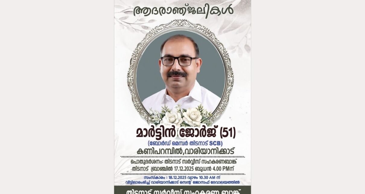 വാരിയാനിക്കാട്: കണിപറമ്പിൽ കെ.വി.ജോർജിന്റെയും അച്ചാമ്മയുടെയും മകൻ തിടനാട് സർവീസ് സഹകരണബാങ്ക് ഭരണസമിതിയംഗം മാർട്ടിൻ ജോർജ് (51) അന്തരിച്ചു. മൃതദേഹം ഇന്ന് വൈകുന്നേരം 5ന് വസതിയിൽ കൊണ്ടുവരും. സംസ്കാരം നാളെ 10.30ന് വസതിയിൽ ശുശ്രൂഷയ്ക്ക് ശേഷം വാരിയാനിക്കാട് സെന്റ് ജോസഫ് പള്ളിയിൽ. ഭാര്യ: നെടുങ്കണ്ടം ചെത്തിമറ്റത്തിൽ ബോബിമോൾ സെബാസ്റ്റ്യൻ (അയർലൻഡ്). മകൻ: ജോർഡി മാർട്ടിൻ ജോർജ്.