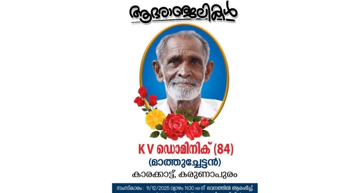 കരുണാപുരം കാരയ്ക്കാട്ട് ഡോമിനിക് (മാത്തു ചേട്ടൻ -85) നിര്യാതനായി. സംസ്ക്കാരം നാളെ (11/12/2025) 12 മണിക്ക് ഇടുക്കി കരുണാപുരം സെന്റ് മേരീസ് പള്ളിയിൽ. ഭൗതികദേഹം ഇന്ന് വൈകിട്ട് വീട്ടിൽ കൊണ്ടുവരും.
