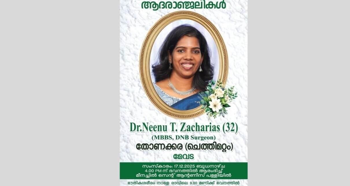 പാലാ: മീനച്ചിൽ സ്വദേശിനിയായ യുവ ഡോക്ടർ കുഴഞ്ഞുവീണ് മരിച്ച നിലയിൽ. മീനച്ചിൽ മൂലെത്തുണ്ടി ഭാഗത്ത് താമസിക്കുന്ന തോണക്കര സക്കറിയ ജോസഫിന്റെ മകൾ നീനു (29) ആണ് മരിച്ച നിലയിൽ കാണപ്പെട്ടത്. വീട്ടുകാർ അടുത്തുള്ള സ്വകാര്യ ആശുപത്രിയിൽ എത്തിച്ചെങ്കിലും മരണം സ്ഥിരീകരിക്കുകയായിരുന്നു. നാളെ രാവിലെ 10 മണിക്ക് കോട്ടയം മെഡിക്കൽ കോളേജിൽ പോസ്റ്റുമോർട്ടം നടക്കും. സംസ്കാരം ബുധനാഴ്ച (17/ 12/ 2025) 4 മണിക്ക് ഭവനത്തിൽ ആരംഭിച്ച് മീനച്ചിൽ സെൻറ് ആൻറണീസ് പള്ളിയിൽ. പഠനത്തെ തുടർന്ന് സ്വകാര്യ ആശുപത്രിയിൽ Read More…