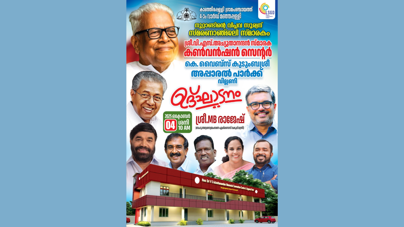 വി.എസ്. കൺവെൻഷൻ സെന്ററിന്റെയും, കുടുംബശ്രീ കെ -വൈബ്സ് അപ്പാരൽ പാർക്കിന്റെയും ഉദ്ഘാടനം ബഹു.തദ്ദേശ സ്വയംഭരണ വകുപ്പ് മന്ത്രി എം.ബി രാജേഷ് 2025 ഒക്ടോബർ 4 ശനിയാഴ്ച രാവിലെ 10 ന് വില്ലണി മൈത്രി നഗറിൽ നിർവഹിക്കു കയാണ് .വോളീബോൾ ഷട്ടിൽ കോർട്ടിന്റെ ഉദ്ഘാടനം ഗവ ചീഫ് വിപ്പ് ഡോ. എൻ. ജയരാജും നിർവഹിക്കും.