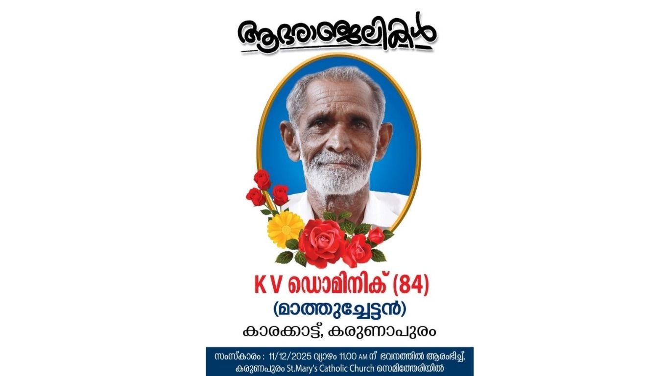 കരുണാപുരം കാരയ്ക്കാട്ട് ഡോമിനിക് (മാത്തു ചേട്ടൻ -85) നിര്യാതനായി. സംസ്ക്കാരം നാളെ (11/12/2025) 12 മണിക്ക് ഇടുക്കി കരുണാപുരം സെന്റ് മേരീസ് പള്ളിയിൽ. ഭൗതികദേഹം ഇന്ന് വൈകിട്ട് വീട്ടിൽ കൊണ്ടുവരും.