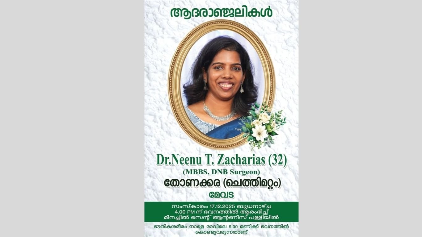 പാലാ: മീനച്ചിൽ സ്വദേശിനിയായ യുവ ഡോക്ടർ കുഴഞ്ഞുവീണ് മരിച്ച നിലയിൽ. മീനച്ചിൽ മൂലെത്തുണ്ടി ഭാഗത്ത് താമസിക്കുന്ന തോണക്കര സക്കറിയ ജോസഫിന്റെ മകൾ നീനു (29) ആണ് മരിച്ച നിലയിൽ കാണപ്പെട്ടത്.