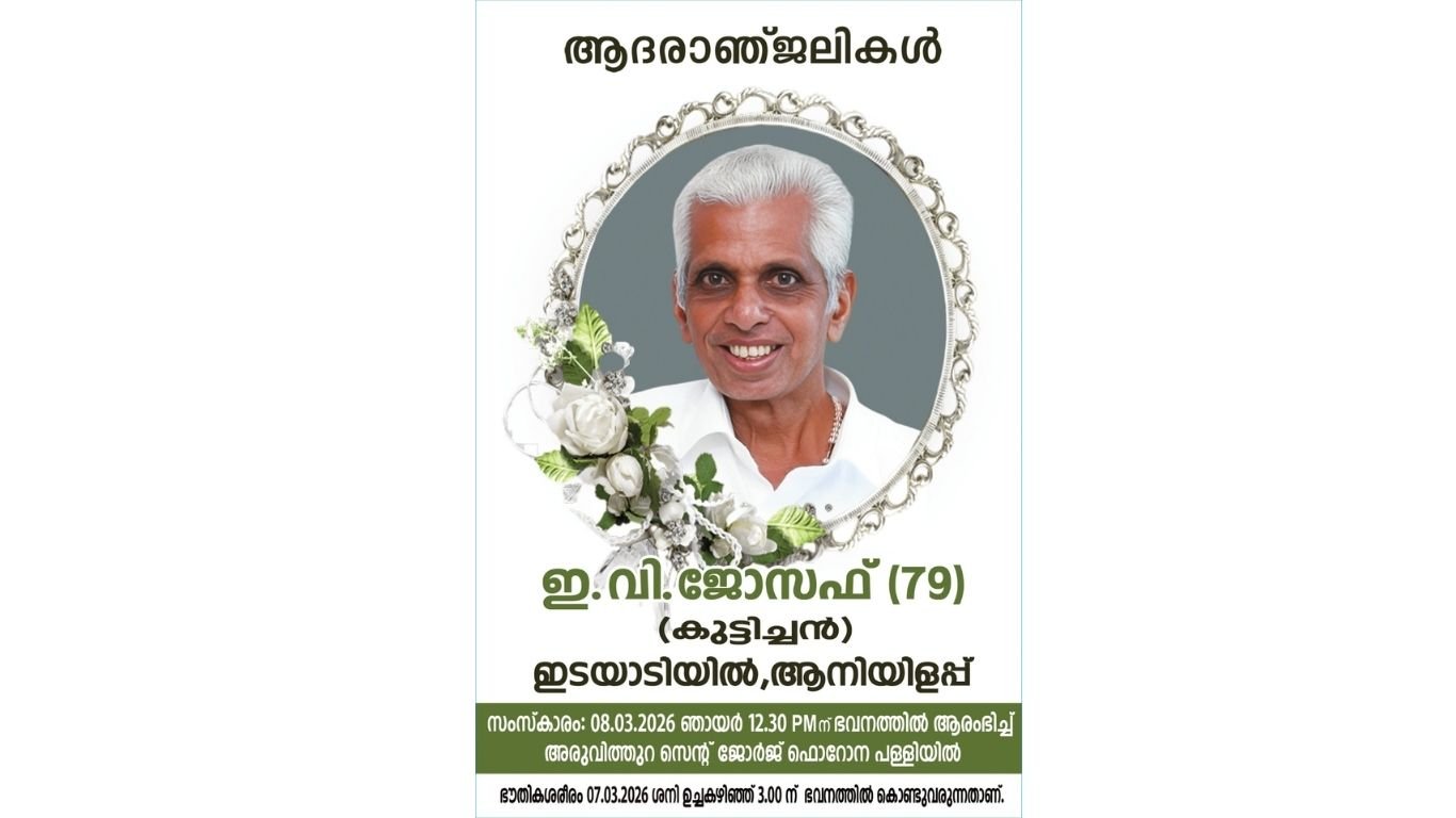 ആനിയിളപ്പ്: ഇടയാടിയിൽ ഇ.വി. ജോസഫ് (കുട്ടിച്ചൻ- 79) നിര്യാതനായി. മൃതസംസ്കാര ശുശ്രുഷകൾ ഇന്ന് (08/03/2026 ) 12.30 ന് ഭവനത്തിൽ ആരംഭിച്ച് അരുവിത്തുറ സെന്റ് ജോർജ്ജ് ഫൊറോന പള്ളിയിൽ സംസ്കരിക്കുന്നതുമാണ്.