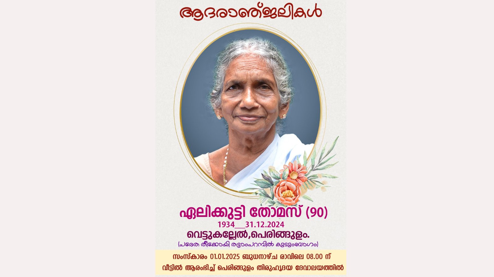 പൂഞ്ഞാർ : വെട്ടുകല്ലേൽ ഏലിക്കുട്ടി തോമസ് (90 )നിര്യാതയായി. പരേത തീക്കോയി തട്ടാംപറമ്പിൽ കുടുംബാംഗം. സംസ്കാരം നാളെ (ബുധനാഴ്ച) രാവിലെ 8 മണിക്ക് വീട്ടിൽ ആരംഭിച്ച് പെരിങ്ങുളം തിരുഹൃദയ ദേവാലയത്തിൽ.