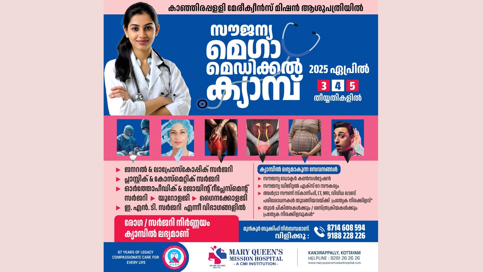 കാഞ്ഞിരപ്പളളി: മേരീക്വീൻസ് മിഷൻ ആശുപത്രിയിൽ സൗജന്യ രോഗ, സർജറി നിർണ്ണയ സൗകര്യമൊരുക്കി മെഗാ മെഡിക്കൽ ക്യാമ്പ് 2025 ഏപ്രിൽ 3, 4, 5 തീയതികളിൽ നടക്കും. മുൻകൂർ ബുക്കിംഗ് സൗകര്യത്തോടെ നടത്തുന്ന ക്യാമ്പിൽ പങ്കെടുക്കുന്നവർക്ക് ജനറൽ & ലാപ്രോസ്കോപ്പിക് സർജറി, ഓർത്തോപീഡിക് ആൻഡ് ജോയിന്റ് റീപ്ലേസ്മെന്റ്, പ്ലാസ്റ്റിക് ആൻഡ് കോസ്മെറ്റിക് സർജറി, യൂറോളജി, ഗൈനക്കോളജി, ഇ എൻ ടി സർജറി വിഭാഗങ്ങളിൽ ഡോക്ടർ കൺസൾട്ടേഷൻ സൗജന്യമായി ലഭ്യമാകും.