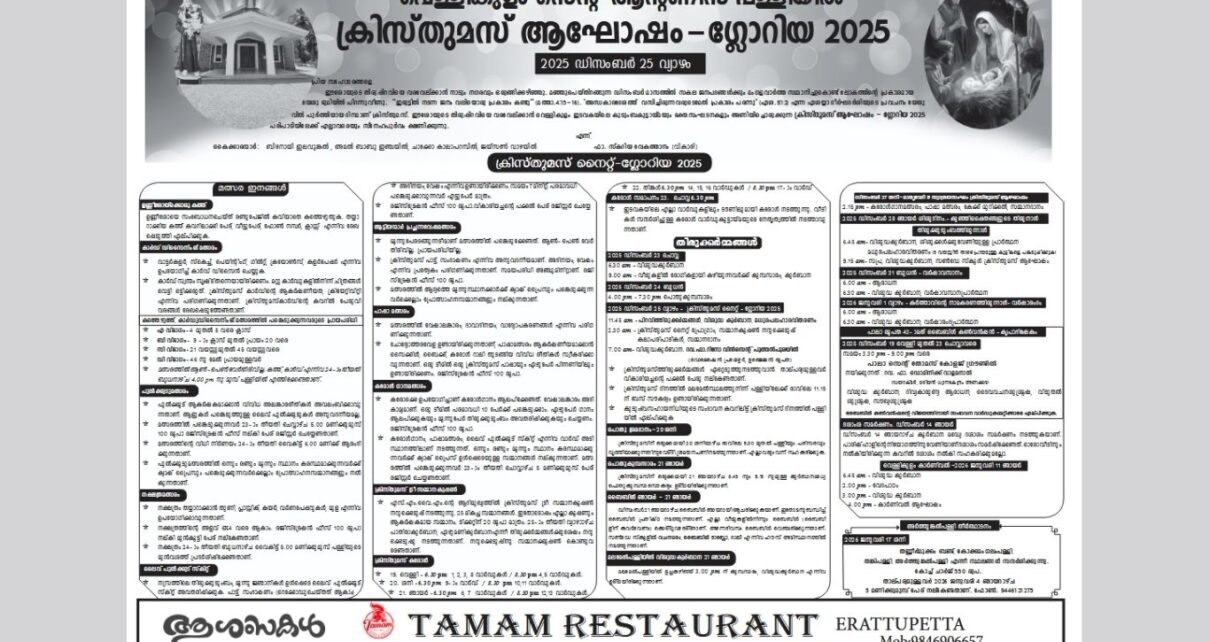 തുടർന്ന് ക്രിസ്തുമസ് നൈറ്റ് പ്രോഗ്രാം – ഗ്ലോറിയ 2025.ഇതോടനുബന്ധിച്ച് ക്രിസ്തുമസ് ട്രീ സമ്മാനക്കൂപ്പൺ നറുക്കെടുപ്പ്, ലൈവ് പുൽക്കൂട് സ്കിറ്റ് മത്സരം , ആട്ടിടയന്മാർ പ്രഛന്നവേഷ മത്സരം, പാപ്പാ മത്സരം, കരോൾ ഗാന മത്സരം എന്നിവ നടത്തപ്പെടും.