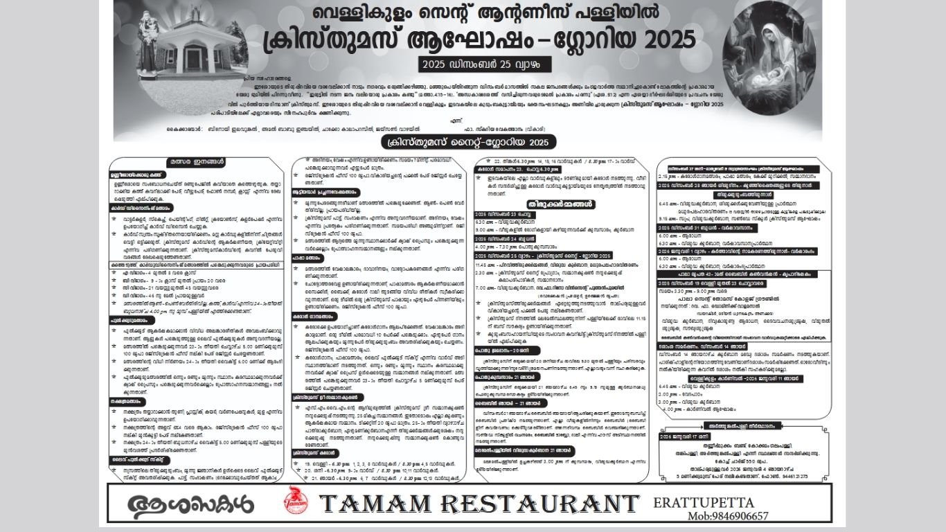 വെള്ളികുളം:വെള്ളികുളം സെൻ്റ് ആൻ്റണീസ് പള്ളിയിൽ ക്രിസ്തുമസ് – ഗ്ലോറിയ 2025 വിപുലമായി ആഘോഷിക്കും. 24 തീയതി വെളുപ്പിന് 11.45 am ന് ആഘോഷമായ ക്രിസ്തുമസ് തിരുക്കർമ്മങ്ങൾ,പാട്ടു കുർബാന, സന്ദേശം, ഫാ.സ്കറിയ വേകത്താനം, കേക്ക് വിതരണം
