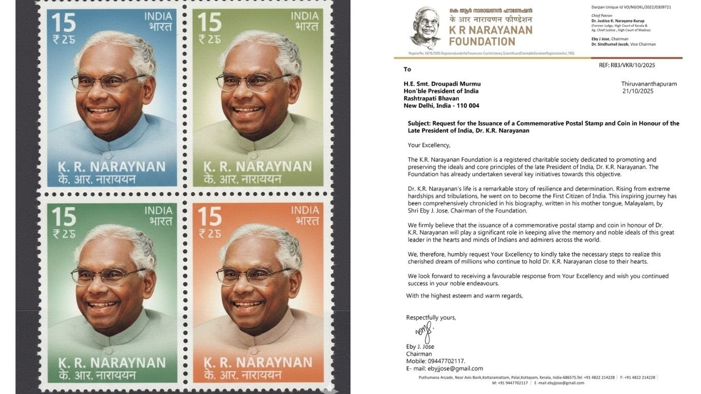 പാലാ: മുൻ രാഷ്ട്രപതി കെ ആർ നാരായണൻ്റെ സ്മരണയ്ക്കായി തപാൽ സ്റ്റാമ്പ് പുറത്തിറക്കുന്നതിനാവശ്യമായ നടപടികൾക്കു തുടക്കമായി. ഈ ആവശ്യമുന്നയിച്ച് കെ ആർ നാരായണൻ ഫൗണ്ടേഷൻ ചെയർമാൻ എബി ജെ ജോസ്, വൈസ് ചെയർമാൻ ഡോ സിന്ധുമോൾ ജേക്കബ് എന്നിവർ രാഷ്ട്രപതി ദ്രൗപദി മുർമു തിരുവനന്തപുരം രാജ്ഭവനിൽ വച്ച് 21 ന് നിവേദനം നൽകിയിരുന്നു.