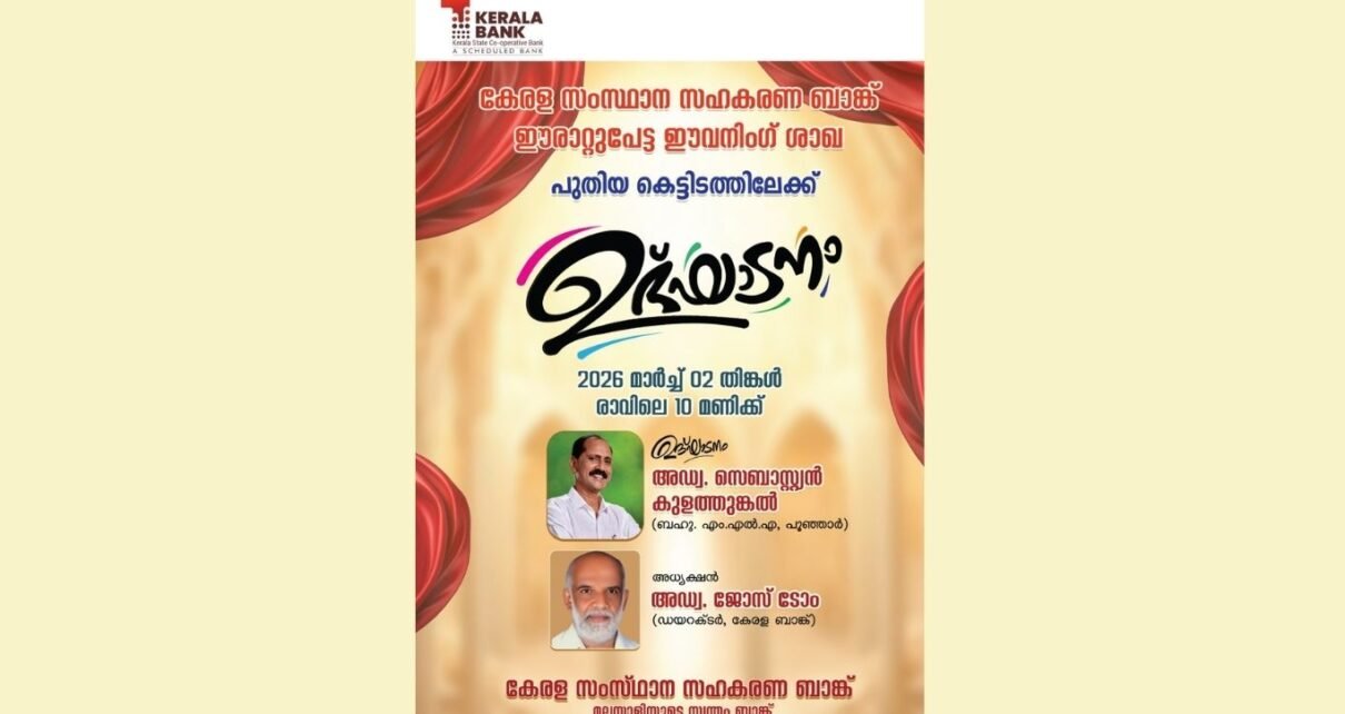 സെബാസ്റ്റ്യൻ കുളത്തുങ്കൽ എം.എൽ.എ. ശാഖയുടെ പ്രവർത്തന ഉദ്ഘാടനം ചെയ്യും. കേരള ബാങ്ക് ഡയറക്ടർ അഡ്വ ജോസ് ടോം അധ്യക്ഷത വഹിക്കും.