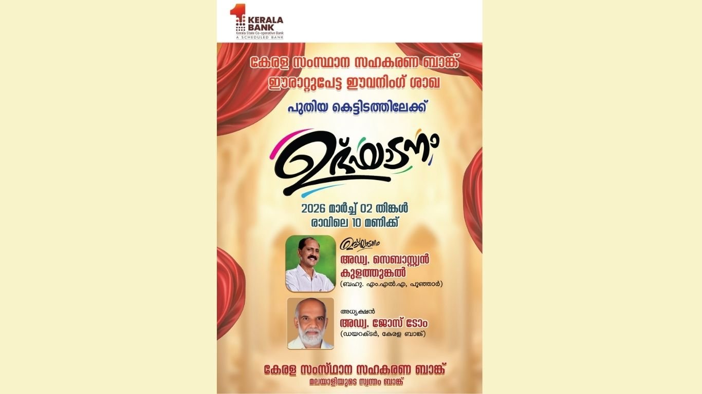 സെബാസ്റ്റ്യൻ കുളത്തുങ്കൽ എം.എൽ.എ. ശാഖയുടെ പ്രവർത്തന ഉദ്ഘാടനം ചെയ്യും. കേരള ബാങ്ക് ഡയറക്ടർ അഡ്വ ജോസ് ടോം അധ്യക്ഷത വഹിക്കും.