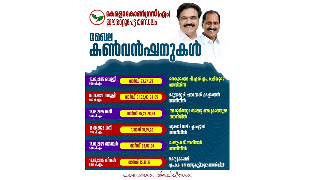 ഈരാറ്റുപേട്ട: കേരളാ കോൺസ് (എം) ഈരാറ്റുപേട്ട മണ്ഡലം കൺവൻഷനുകൾ ആഗസ്റ്റ് 15 മുതൽ വിവിധ കേന്ദ്രങ്ങളിൽ നടക്കും.