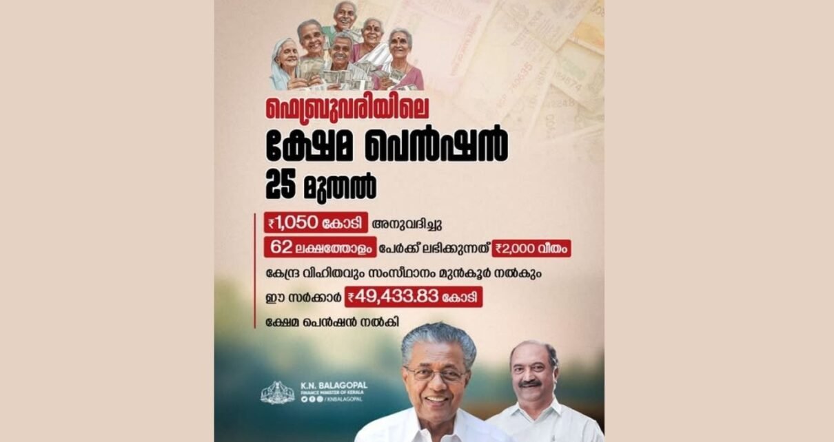 ഫെബ്രുവരിയിലെ സാമൂഹ്യ സുരക്ഷ, ക്ഷേമനിധി പെന്ഷനുകള് 25 മുതല് വിതരണം തുടങ്ങും. ഇതിനായി 1,050 കോടി രൂപ അനുവദിച്ചു. 62 ലക്ഷത്തോളം പേര്ക്കാണ് 2,000 രൂപവീതം പെന്ഷന് ലഭിക്കുക. 26.62 ലക്ഷം പേരുടെ ബാങ്ക് അക്കൗണ്ടുകളില് തുക എത്തും. മറ്റുള്ളവര്ക്ക് സഹകരണ ബാങ്കുകള് വഴി വീട്ടിലെത്തി നേരിട്ട് തുക കൈമാറും.
