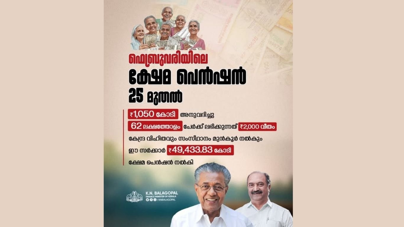 ഫെബ്രുവരിയിലെ സാമൂഹ്യ സുരക്ഷ, ക്ഷേമനിധി പെന്ഷനുകള് 25 മുതല് വിതരണം തുടങ്ങും. ഇതിനായി 1,050 കോടി രൂപ അനുവദിച്ചു. 62 ലക്ഷത്തോളം പേര്ക്കാണ് 2,000 രൂപവീതം പെന്ഷന് ലഭിക്കുക. 26.62 ലക്ഷം പേരുടെ ബാങ്ക് അക്കൗണ്ടുകളില് തുക എത്തും. മറ്റുള്ളവര്ക്ക് സഹകരണ ബാങ്കുകള് വഴി വീട്ടിലെത്തി നേരിട്ട് തുക കൈമാറും.