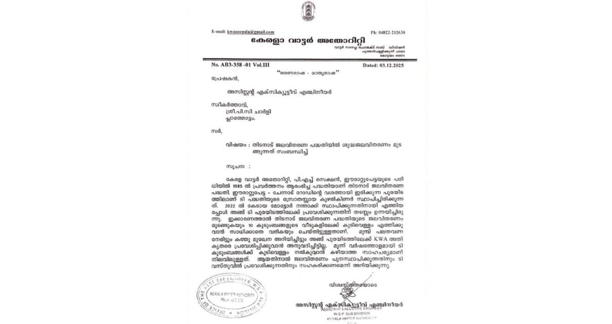 ഈരാറ്റുപേട്ട : കേരള വാട്ടർ അതോറിറ്റിയുടെ കീഴിലുള്ള തിടനാട് ജല വിതരണ പദ്ധതിയുടെ ജലസ്രോതസ്സ് ആയിരുന്ന കുഴൽ കിണറും അതിനോടനുബന്ധിച്ചുള്ള മോട്ടോറും, പമ്പ് ഹൗസും അനധികൃതമായി കയ്യടക്കി വെച്ചിരിക്കുന്നത് വിട്ടു നൽകണമെന്നും മോട്ടോർ നന്നാക്കാനും മറ്റും വസ്തുവിൽ കയറുന്നതിന് അനുവദിക്കണമെന്നും കാണിച്ച് പി.സി ചാർളി, പ്ലാത്തോട്ടം, അരുവിത്തുറ എന്നയാൾക്ക് കേരള വാട്ടർ അതോറിറ്റി അസിസ്റ്റന്റ് എക്സിക്യൂട്ടീവ് എഞ്ചിനീയർ നോട്ടീസ് അയച്ചു.