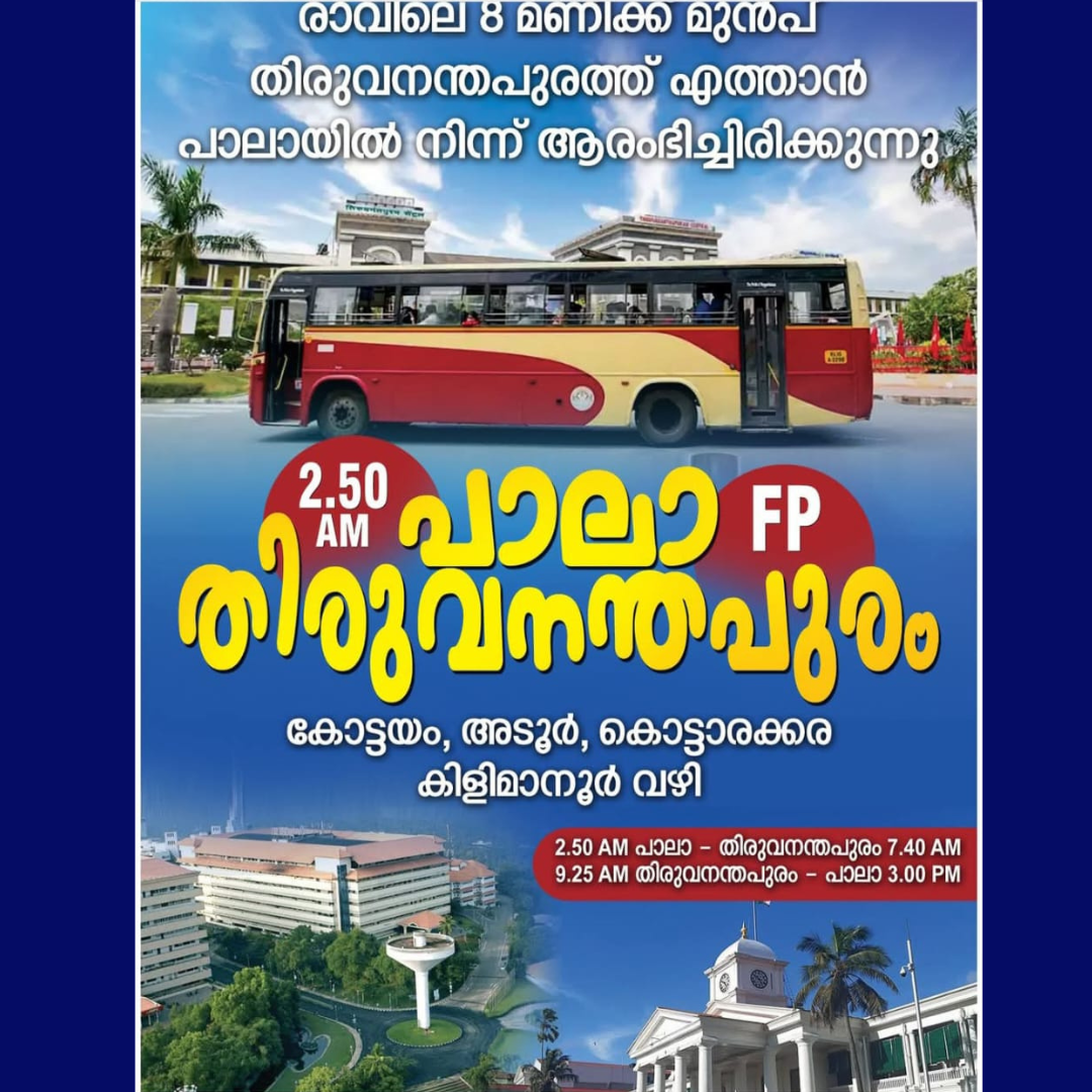 പാലാ: വെളുപ്പിന് പാലായിൽ നിന്നും തിരുവനന്തപുരത്തേയ്ക്ക് പാലാ ഡിപ്പോയിൽ നിന്നും പുതിയ സർവ്വീസ് ആരംഭിച്ചു. അതിരാവിലെ 2.50 മണിക്കാണ് സർവ്വീസ് .തിരുവനന്തപുരം ഭാഗത്തേയ്ക്ക് അതിരാവിലെ എത്തിച്ചേരേണ്ടവർക്ക് വളരെ സഹായകരമായ വിധമുള്ള സർവ്വീസാണിത്.