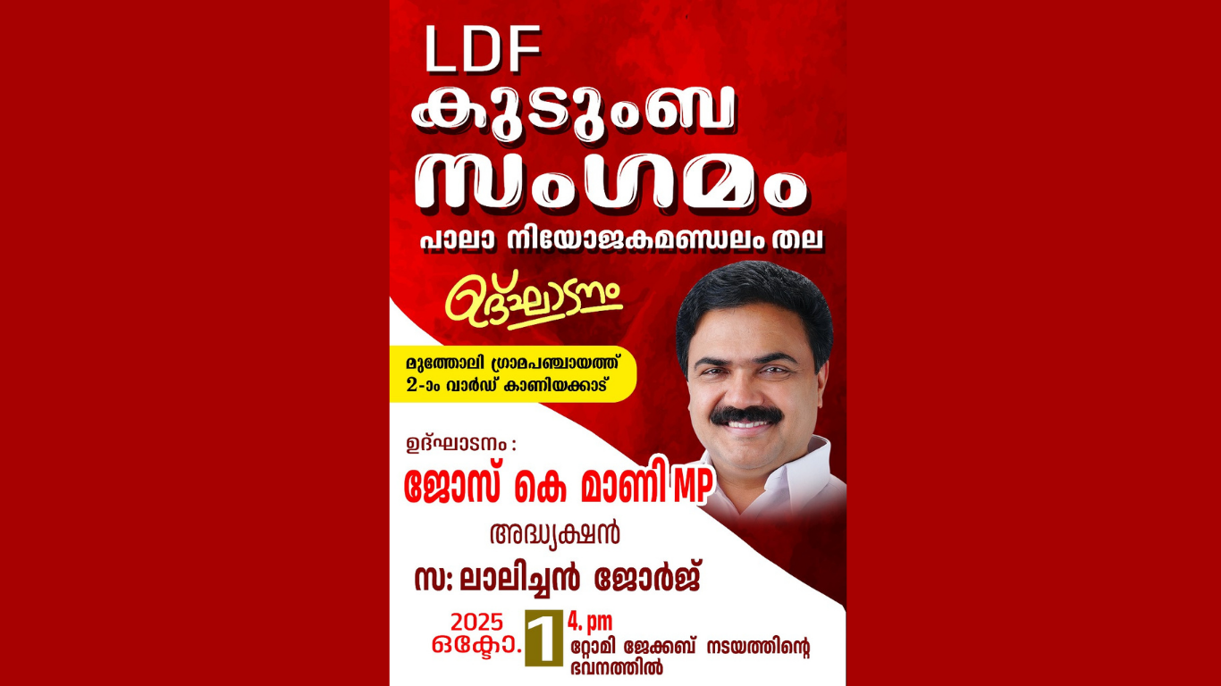 നിയോജക മണ്ഡലം തല ആദ്യ കുടുംബ സംഗമം മുത്തോലി പഞ്ചായത്തിലെ കാണിയക്കാട് വാർഡിൽ ഇന്ന് വൈകുന്നേരം 4.30 ന് ജോസ്.കെ.മാണി എം.പി ഉദ്ഘാടനം ചെയ്യും.എൽ.ഡി.എഫ് ജില്ലാ, നിയോജക മണ്ഡലം നേതാക്കൾ യോഗത്തിൽ പ്രസംഗിക്കും.