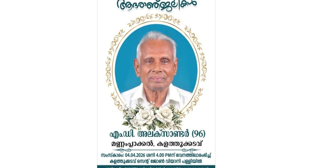 കളത്തുകടവ്: മണ്ണംപ്ലാക്കൽ റിട്ട. പഞ്ചായത്ത് സ്പെഷൽ ഓഫിസർ മണ്ണംപ്ലാക്കൽ എം.ഡി.അലക്സാണ്ടർ (97) നിര്യാതനായി. മൃതദേഹം ശനിയാഴ്ച രാവിലെ 9നു വസതിയിൽ കൊണ്ടുവരും. സംസ്കാരം ശനിയാഴ്ച (4/04/2024) വൈകിട്ട് 4 മണിക്ക് കളത്തുകടവ് സെന്റ് ജോൺ വിയാനി പള്ളിയിൽ.