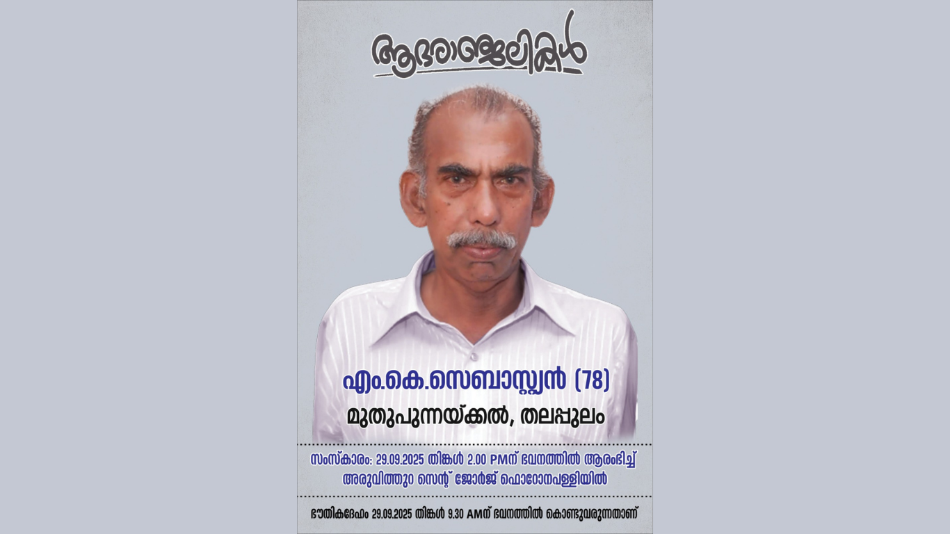 തലപ്പലം : മുതുപുന്നക്കൽ എം.കെ. സെബാസ്റ്റ്യൻ (78) നിര്യാതനായി. ഭൗതികശരീരം നാളെ, (29.09.2025) രാവിലെ 9 ന് സ്വവസതിയിൽ കൊണ്ടുവരുന്നതും മൃതസംസ്കാര ശുശ്രൂഷകൾ ഉച്ചകഴിഞ്ഞ് 2 ന് ഭവനത്തിൽ ആരംഭിച്ച് അരുവിത്തുറ സെന്റ് ജോർജ് ഫൊറോനാ പള്ളിയിൽ സംസ്കരിക്കുന്നതാണ്.
