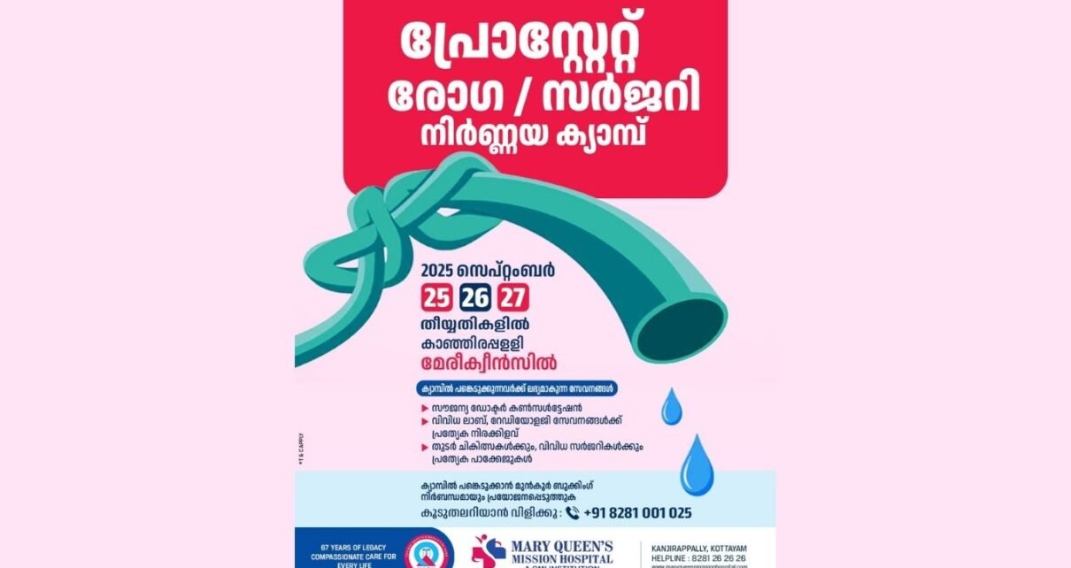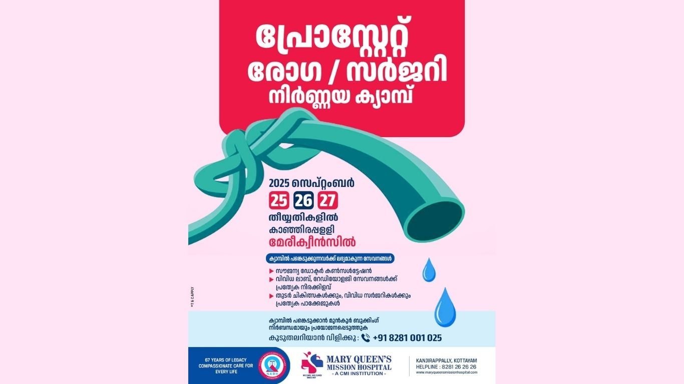 കാഞ്ഞിരപ്പളളി: മേരീക്വീൻസ് മിഷൻ ആശുപത്രിയിലെ യൂറോളജി വിഭാഗത്തിൽ പ്രോസ്റ്റേറ്റ് രോഗ, സർജറി നിർണ്ണയ ക്യാമ്പ് 2025 സെപ്റ്റംബർ 25, 26, 27 തീയ്യതികളിൽ നടത്തപ്പെടുന്നു. ക്യാമ്പിൽ പങ്കെടുക്കുന്നവർക്ക് സൗജന്യ ഡോക്ടർ കൺസൾട്ടേഷൻ, വിവിധ ലാബ്, റേഡിയോളജി സേവനങ്ങൾക്ക് പ്രത്യേക നിരക്കിളവ്, തുടർ ചികിത്സകൾക്കും, വിവിധ സർജറികൾക്കും പ്രത്യേക പാക്കേജുകൾ എന്നിവ ലഭ്യമാകും.