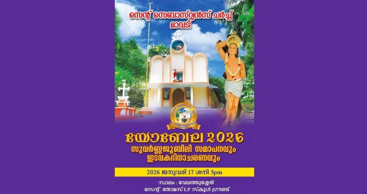 വേലത്തുശ്ശേരി: മാവടി സെന്റ് സെബാസ്റ്റ്യൻസ് പള്ളിയിൽ സുവർണ്ണ ജൂബിലി തിരുന്നാളിനോട് അനുബന്ധിച്ചുള്ള ജൂബിലി സമാപന സമ്മേളനവും ഇടവക ദിനാചരണവും യോബേല -2026 ഇന്ന് നടക്കും. മൂന്ന് മണിക്ക് എവറസ്റ്റ് മാവടി മുപ്പതേക്കർ കരകളിൽ നിന്ന് കഴുന്ന് പ്രദിക്ഷണം.
