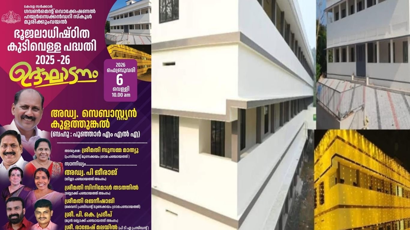 മുരിക്കുംവയൽ: ഗവൺമെൻറ് വൊക്കേഷണൽ ഹയർസെക്കൻഡറി സ്കൂളിൽ ഭൂജലാധിഷ്ഠിത കുടിവെള്ള പദ്ധതി 2025-26 ന്റെ ഉദ്ഘാടനം ബഹു. പൂഞ്ഞാർ എം എൽ എ അഡ്വക്കേറ്റ് സെബാസ്റ്റ്യൻ കുളത്തുങ്കൽ ഫെബ്രുവരി 6 ന് രാവിലെ 10 മണിയ്ക് ചടങ്ങിൽ സൂസമമ മാത്യൂ(പ്രസിഡൻ്റ്, മുണ്ടക്കയം ഗ്രാമ പഞ്ചായത്ത്) അധ്യക്ഷത വഹിക്കും അഡ്വ. പി ജിരാജ്(ജില്ലാ പഞ്ചായത്ത് അംഗം) പ്രഭാത ഭക്ഷണ വിതരണ ഉത്ഘാടനം നടത്തും.