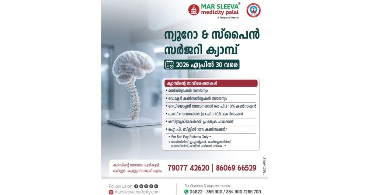 പാലാ: മാർ സ്ലീവാ മെഡിസിറ്റിയിൽ ന്യൂറോ ആൻഡ് സ്പൈൻ സർജറി ക്യാമ്പ് ഏപ്രിൽ 30 വരെ നടത്തും. നാഡീവ്യൂഹവും, നട്ടെല്ല് സംബന്ധവുമായ രോ​ഗങ്ങൾക്ക് വി​ദ​ഗ്ധ പരിശോധനയും ചികിത്സയും ക്യാമ്പിൽ പങ്കെടുക്കുന്നവർക്ക് ലഭ്യമാണ്.