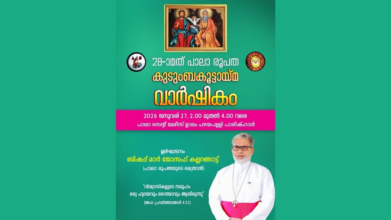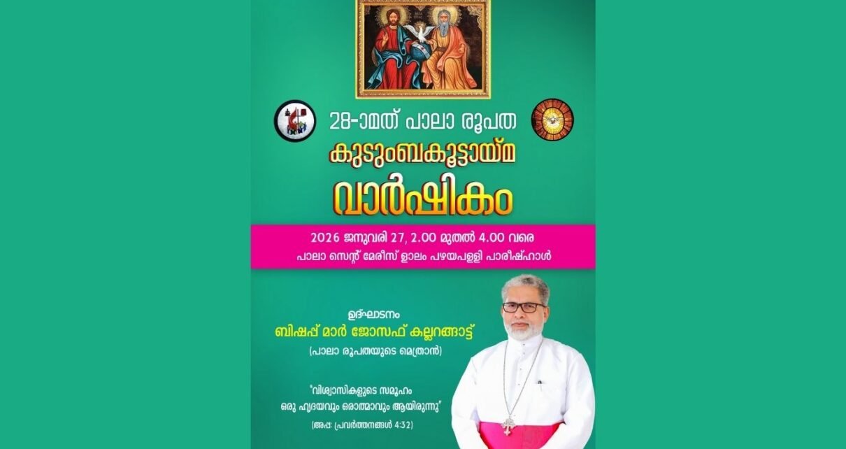 പാലാ : പാലാ രൂപതാ കുടുംബ കൂട്ടായ്മ സമ്മേളനം ജനുവരി 27, ചൊവാഴ്ച 2 മണിക്ക് ളാലം സെൻ്റ് മേരീസ് പ പള്ളി ഹാളിൽ വച്ച് നടത്തുന്നു. 1.30 ന് രജിസ്ട്രഷൻ. ബൈബിൾ പ്രതിഷ്ഠയോടു കൂടി ആരംഭിക്കുന്ന പരിപാടി പാലാ രൂപതാധ്യക്ഷൻ മാർ ജോസഫ് കല്ലറങ്ങാട്ട് ഉദ്ഘാടനം ചെയ്യും.