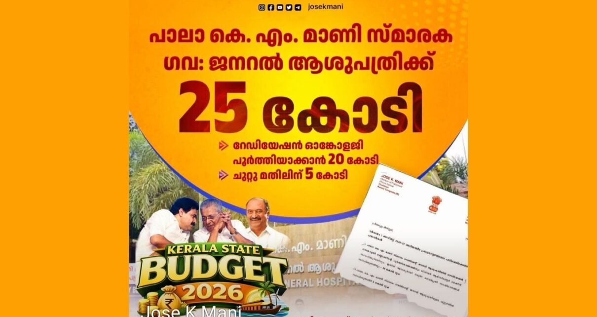 പാലാ : സംസ്ഥാന ബജറ്റില്‍ പാലാ കെ.എം മാണി സ്മാരക ഗവണ്‍മെന്റ് ജനറല്‍ ഹോസ്പിറ്റലിന് 25 കോടി രൂപ ലഭ്യമായതായി ജോസ് കെ.മാണി എം.പി അറിയിച്ചു. ധനമന്ത്രി കെ.എന്‍ ബാലഗോപാലുമായി നടത്തിയ ചര്‍ച്ചയുടെ അടിസ്ഥാനത്തില്‍ ഹോസ്പിറ്റലിലെ റേഡിയേഷന്‍ ഓങ്കോളജി ബ്ലോക്കിന്റെ രണ്ടാം ഘട്ട പ്രവര്‍ത്തനങ്ങള്‍ക്കും പൂര്‍ത്തീകരണത്തിനും 20 കോടി രൂപയും, ഹോസ്പിറ്റലിന്റെ ചുറ്റുമതില്‍ നിര്‍മ്മാണത്തിന് 5 കോടി രൂപയുമാണ് വകകൊള്ളിച്ചിരിക്കുന്നത്.