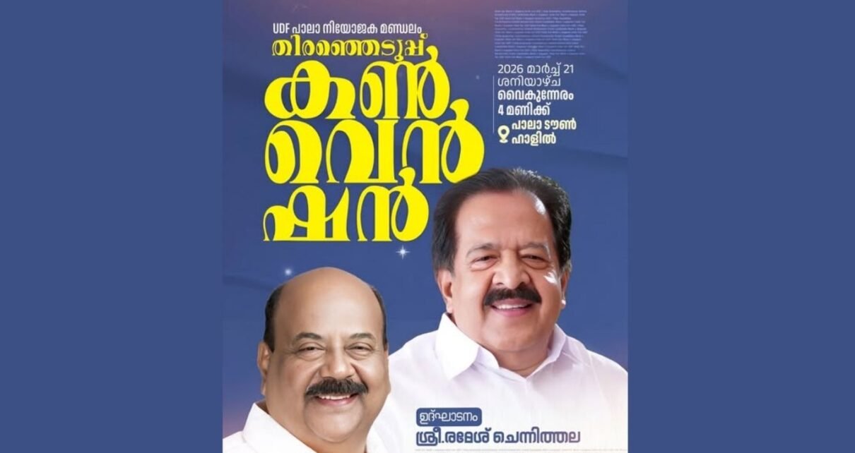 പാലാ: ഐക്യ ജനാധിപത്യമുന്നണി സ്ഥാനാർത്ഥി മാണി സി. കാപ്പന്റെ തെരഞ്ഞെടുപ്പ് കൺവൻഷൻ നാളെ (ശനി) ടൗൺഹാളിൽ നടക്കും. ഉച്ചകഴിഞ്ഞ് 4 മണിക്ക് നടക്കുന്ന യോഗം മുൻ പ്രതിപക്ഷ നേതാവ് രമേശ് ചെന്നിത്തല ഉദ്ഘാടനം ചെയ്യും. നിയോജക മണ്ഡലം ചെയർമാൻ െപ്രാഫ.സതീശ് ചെള്ളാനി അദ്ധ്യക്ഷത വഹിക്കും.