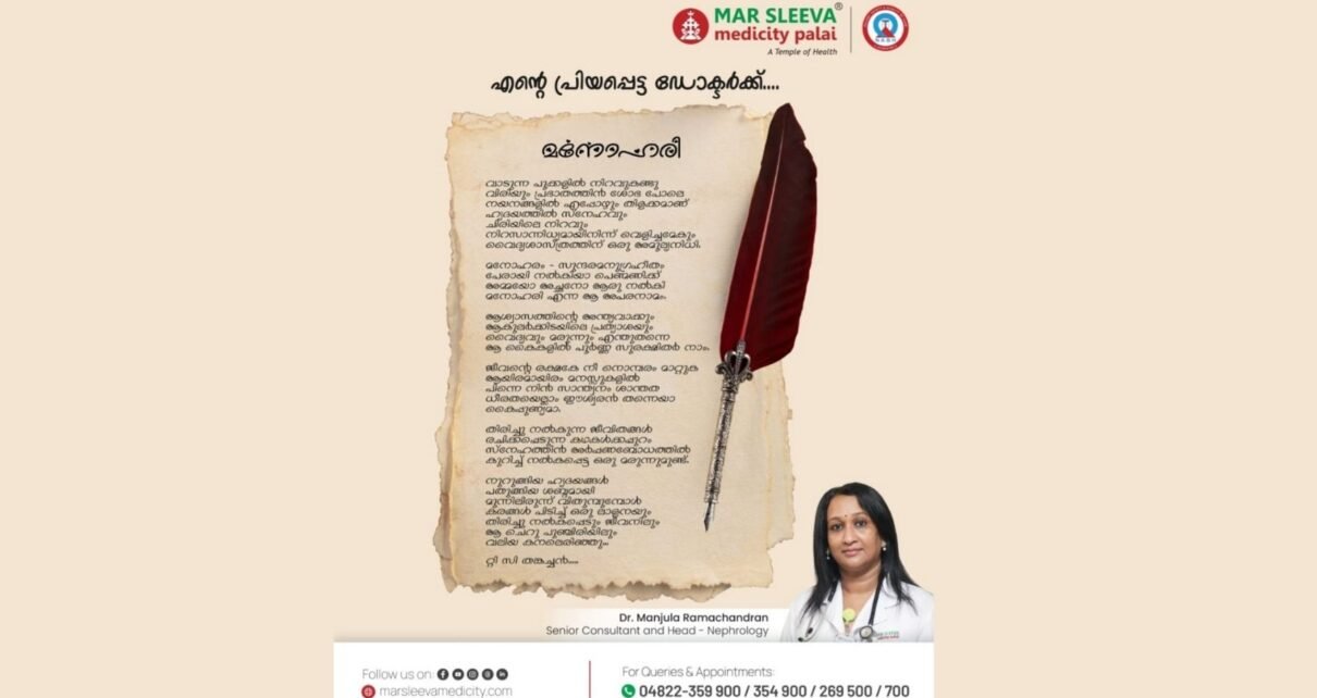 പാലാ: ജീവിതയാത്രയിൽ കിഡ്നി മാറ്റിവയ്ക്കലിനു വിധേയനാക്കപ്പെട്ട അധ്യാപകൻ ചികിത്സിച്ച ഡോക്ടർക്ക് നന്ദി അർപ്പിച്ച് സമർപ്പിച്ചത് മനോഹരമായ ഒരു കവിത ! മാർ സ്ലീവാ മെഡിസിറ്റിയിലെ നെഫ്രോളജി വിഭാഗം മേധാവിയും ട്രാൻസ്പ്ലാന്റ് നെഫ്രോളജിസ്റ്റുമായ ഡോ.മഞ്ജുള രാമചന്ദ്രനെക്കുറിച്ചാണ് പാലാ സെന്റ് തോമസ് കോളജ് ഓഫ് ടീച്ചർ എജ്യൂക്കേഷൻ പ്രിൻസിപ്പൽ പ്രഫ.ടി.സി.തങ്കച്ചൻ കവിത എഴുതി സമർപ്പിച്ചത്. മനോഹരി എന്ന് പേരിട്ടിരിക്കുന്ന കവിത ഡോക്ടർമാർക്കിടയിൽ വൈറലാകുകയും ചെയ്തു.