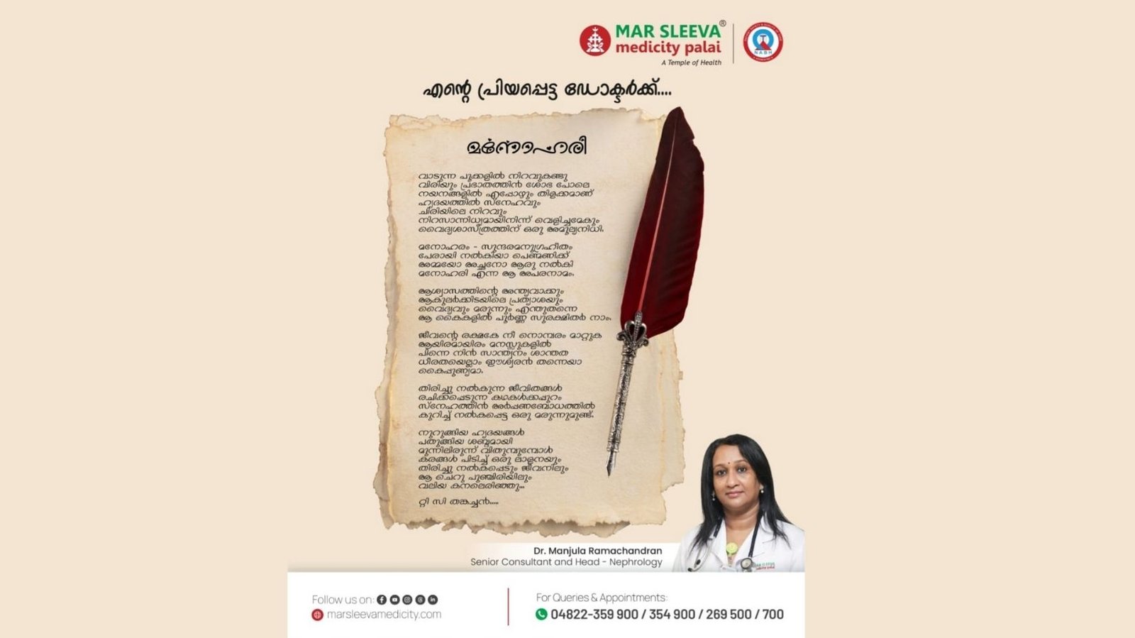 വിശ്രമത്തിൽ കഴിയുന്നതിനിടയിലാണ് ചികിത്സിച്ച ഡോക്ടർക്കു വേണ്ടി 30 വരികളോളം വരുന്ന കവിത എഴുതിയത്. കിഡ്നിമാറ്റിവയ്ക്കൽ ശസ്ത്രക്രിയയിൽ മികവിന്റെ കേന്ദ്രമായ മാർ സ്ലീവാ മെഡിസിറ്റിയിൽ 115ൽ പരം ശസ്ത്രക്രിയകളാണ് ഡോ.മഞ്ജുള രാമചന്ദ്രന്റെ നേതൃത്വത്തിൽ വിജയകരമായി പൂർത്തിയാക്കിയത്.