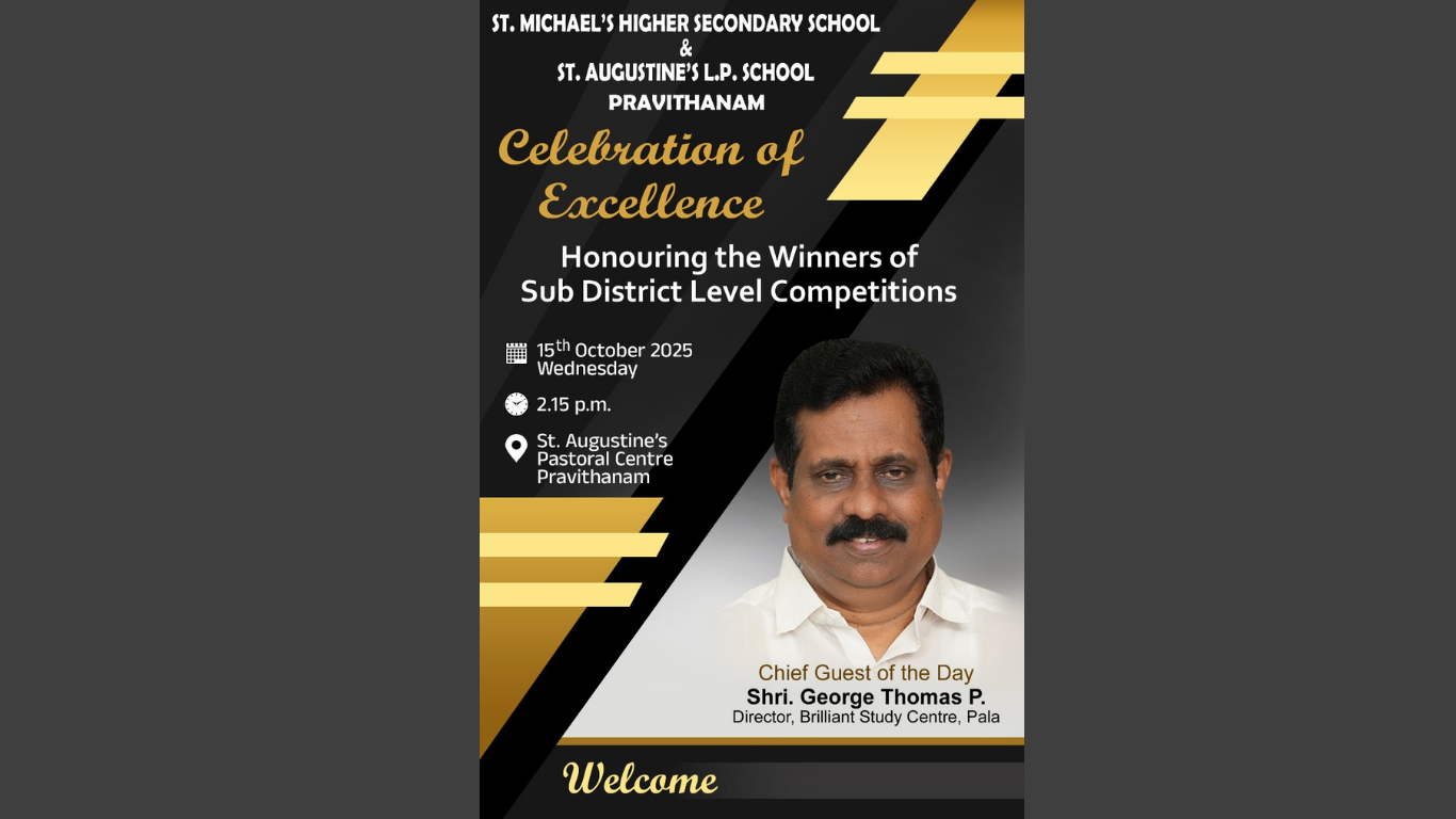 പ്രവിത്താനം: പാലാ ഉപജില്ല ശാസ്ത്ര, ഗണിതശാസ്ത്ര, സാമൂഹ്യശാസ്ത്ര, പ്രവർത്തിപരിചയ, ഐ.ടി. മേളകളിലും, പാലാ ഉപജില്ല സ്പോർട്സ് മീറ്റിലും മികച്ച വിജയം നേടിയ സെൻറ് അഗസ്റ്റിൻസ് എൽ.പി.എസ്., സെൻറ് മൈക്കിൾസ് എച്ച്.എസ്.എസ്. സ്കൂളുകളിലെ പ്രതിഭകളെ ആദരിക്കുന്ന ചടങ്ങ് ഒക്ടോബർ 15 ബുധനാഴ്ച 2.15 പി. എം. ന് സെൻറ് അഗസ്റ്റിൻസ് പാസ്റ്ററൽ സെന്ററിൽ വച്ച് നടക്കുന്നു.