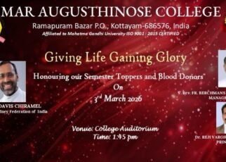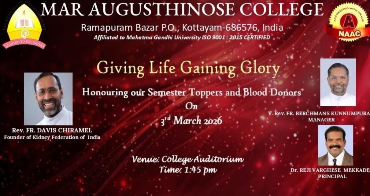 രാമപുരം: ‘രക്ത ദാനം മഹാദാനം’ ഈ സന്ദേശം ഓര്‍മ്മപ്പെടുത്തി രാമപുരം മാർ ആഗസ്തീനോസ് കോളേജിൽ കഴിഞ്ഞ അധ്യയന വർഷം രക്തം ദാനം ചെയ്ത നൂറോളം വിദ്യാർഥികളെ നാളെ (3.03.2026) 1:45 ന് കോളേജിൽ ആദരിക്കുന്നു.