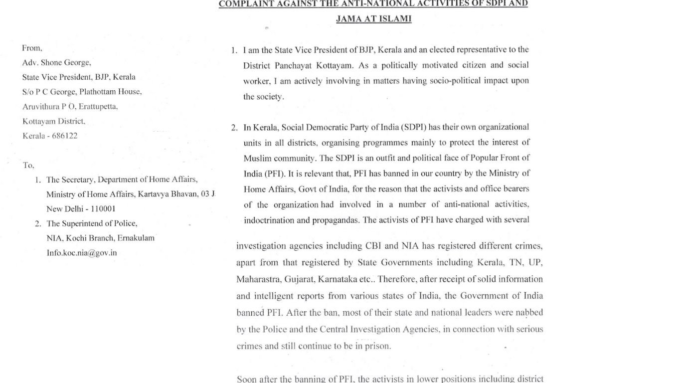 കോഴിക്കോട് താമരശ്ശേരിയിലെ ഫ്രഷ് കട്ട് സ്ഥാപനവുമായി ബന്ധപ്പെട്ട പ്രശ്നങ്ങളിലും, താമരശ്ശേരി ബിഷപ്പിന് ലഭിച്ച ഭീഷണി കത്തിനും പിന്നിലും, കൊട്ടാരക്കരയിലെ ലൗ ജിഹാദിന്റെ പിന്നിലും, കോതമംഗലത്തെ പെൺകുട്ടിയുടെ ആത്മഹത്യയും സെൻട്രൽ സ്കൂളിലെ ഹിജാബ് വിഷയത്തിലും ഉൾപ്പെടെ എസ്ഡിപിഐയുടെയും ജമാഅത്തെ ഇസ്ലാമിയുടെയും ഭീകരബന്ധമുണ്ട് എന്നും പരാതിയിൽ ചൂണ്ടിക്കാട്ടുന്നുണ്ട്.