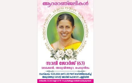 പൊടിമറ്റം: ഫ്രാൻസിസ്കൻ ക്ലാരിസ്റ്റ് കോൺഗ്രിഗേഷൻ കാഞ്ഞിരപ്പള്ളി സെന്റ് തോമസ് പ്രൊവിൻസ് കട്ടപ്പന ഹോളി ഫാമിലി മഠാംഗമായ സിസ്റ്റർ ലെയോ പോൾദ് എഫ്സിസി (87) അന്തരിച്ചു. സംസ്കാരം നാളെ (22-5-25 വ്യാഴം) 1.30 ന് കട്ടപ്പന മഠം ചാപ്പലിൽ വിശുദ്ധ കുർബാനയോടുകുടി ആരംഭിച്ച് കാഞ്ഞിരപ്പള്ളി രൂപതാധ്യക്ഷൻ മാർ ജോസ് പുളിക്കലിന്റെ മുഖ്യകാർമികത്വത്തിൽ കട്ടപ്പന സെന്റ് ജോർജ് പള്ളിയിൽ.