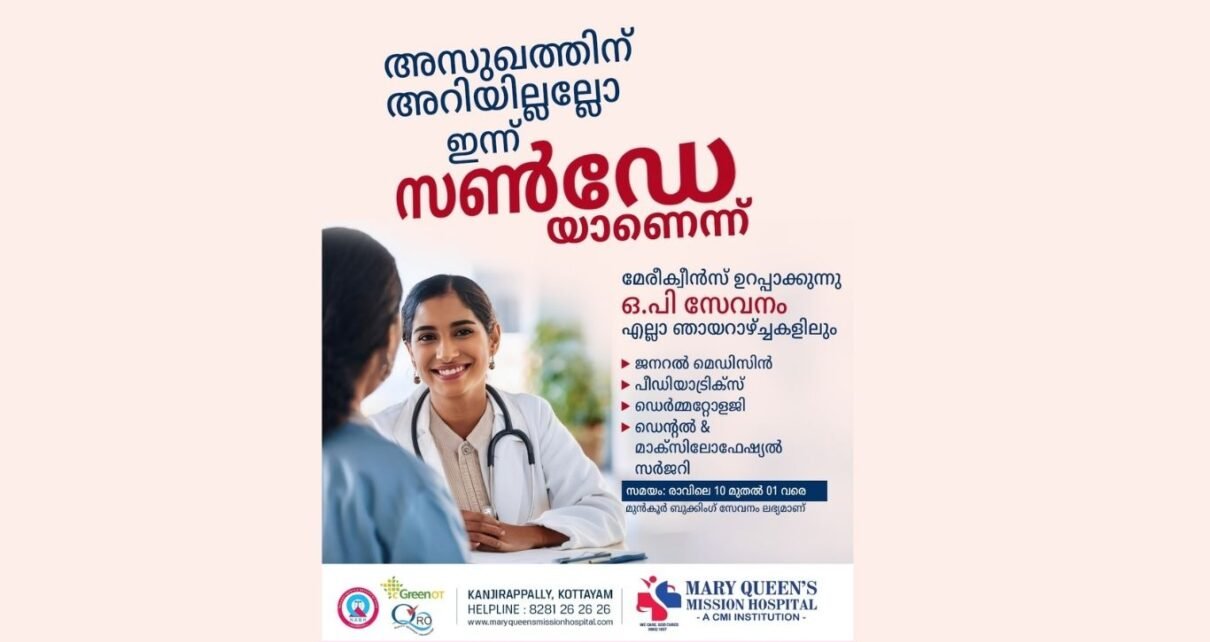 കാഞ്ഞിരപ്പളളി: മേരീക്വീൻസ് മിഷൻ ആശുപത്രിയിൽ ജനറൽ മെഡിസിൻ, പീഡിയാട്രിക്‌, ത്വക്ക് രോഗ ചികിത്സ, ഡെന്റൽ ആൻഡ് മാക്സിലോഫേഷ്യൽ സർജറി വിഭാഗങ്ങളിൽ ഡോക്ടറുടെ സേവനം ഞായറാഴ്ച്ചകളിലും ഒ.പിയിൽ ലഭ്യമാകുമെന്ന് ആശുപത്രി അധികൃതർ അറിയിച്ചു.