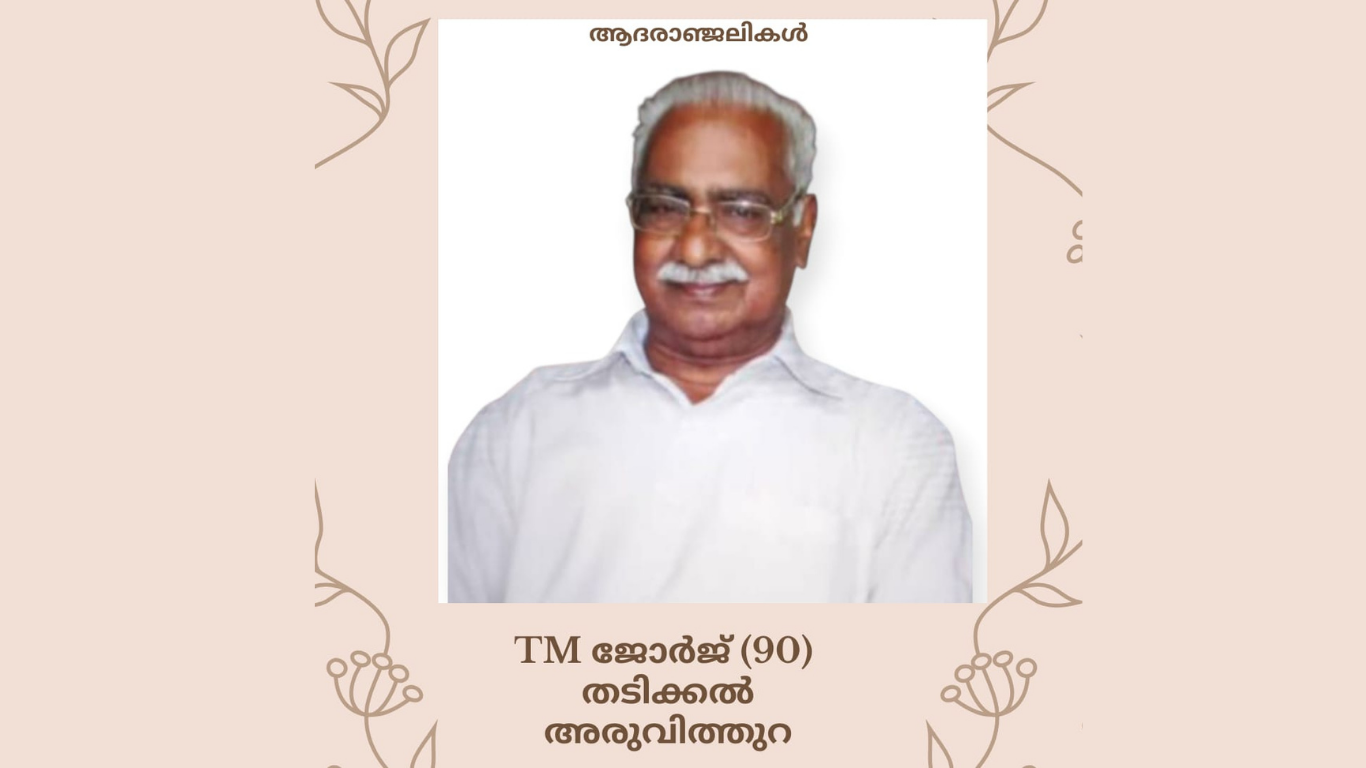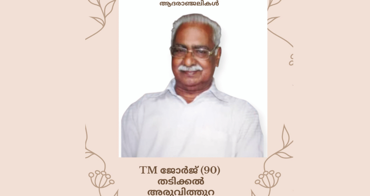അരുവിത്തുറ: തടിക്കൽ ടി.എം. ജോർജ് (അപ്പച്ചൻ -90) നിര്യാതനായി. ഭൗതികശരീരം നാളെ, ഞായറാഴ്ച (26-10-2025) രാവിലെ 9 മണിക്ക് സ്വവസതിയിൽ കൊണ്ടുവരുന്നതും മൃതസംസ്കാര ശുശ്രൂഷകൾ ഉച്ചകഴിഞ്ഞ് 2 മണിക്ക് ഭവനത്തിൽ ആരംഭിച്ച് അരുവിത്തുറ സെന്റ് ജോർജ് ഫൊറോനാ പള്ളിയിൽ സംസ്കരിക്കുന്നതാണ്.