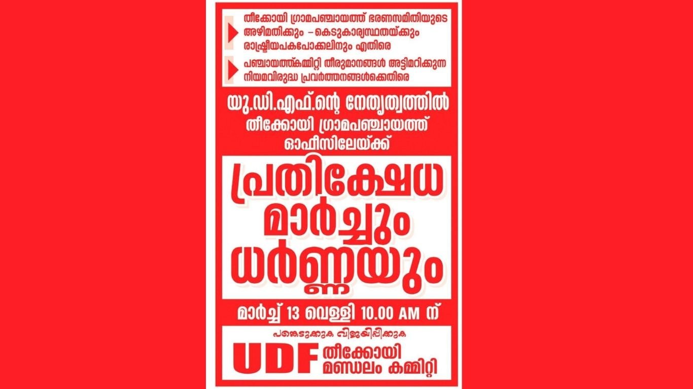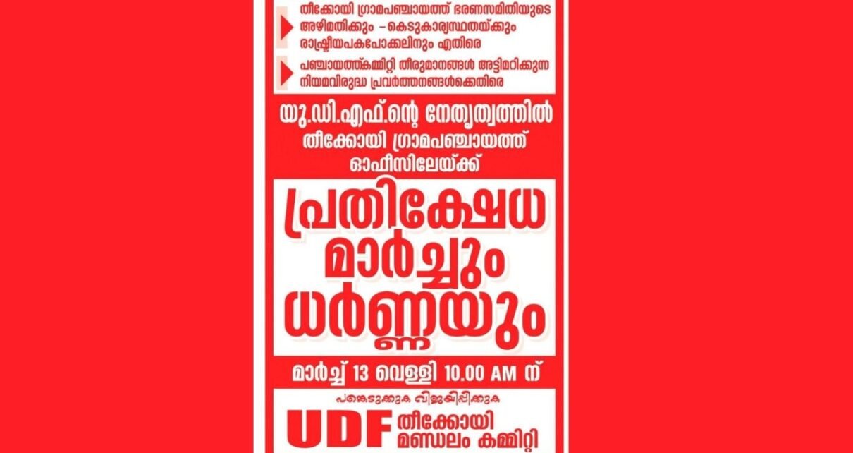 സമരപരിപാടികളുടെ ഭാഗമായി യു. ഡി. എഫ്. തീക്കോയി മണ്ഡലം കമ്മിറ്റിയുടെ നേതൃത്വത്തിൽ മാർച്ച് 13 വെള്ളിയാഴ്ച രാവിലെ 10 മണിക്ക് തീക്കോയി ഗ്രാമപഞ്ചായത്ത് ഓഫീസിലേയ്ക്ക് പ്രതിക്ഷേധ മാർച്ചും ധർണ്ണയും സംഘടിപ്പിക്കും.