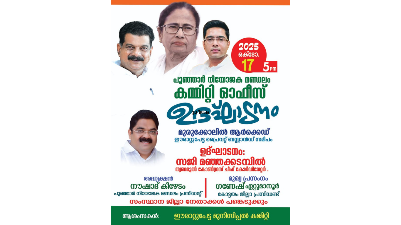 ഈരാറ്റുപേട്ട: ഈരാറ്റുപേട്ട പ്രൈവറ്റ് ബസ്സ് സ്റ്റാൻഡിന് സമീപം മുരുക്കോലിൽ ആർക്കേടിൽ സജ്ജമാക്കിയിരിക്കുന്ന തൃണമൂൽ കോൺഗ്രസ് പൂഞ്ഞാർ നിയോജക മണ്ഡലം കമ്മിറ്റി ഓഫീസ് ഉദ്ഘാടനം 17-10 -2025 വെള്ളിയാഴ്ച 5:00PM ന് തൃണമൂൽ കോൺഗ്രസ് സംസ്ഥാന ചീഫ് കോർഡിനേറ്റർ സജി മഞ്ഞക്കടമ്പിൽ ഉദ്ഘാടനം ചെയ്യും.