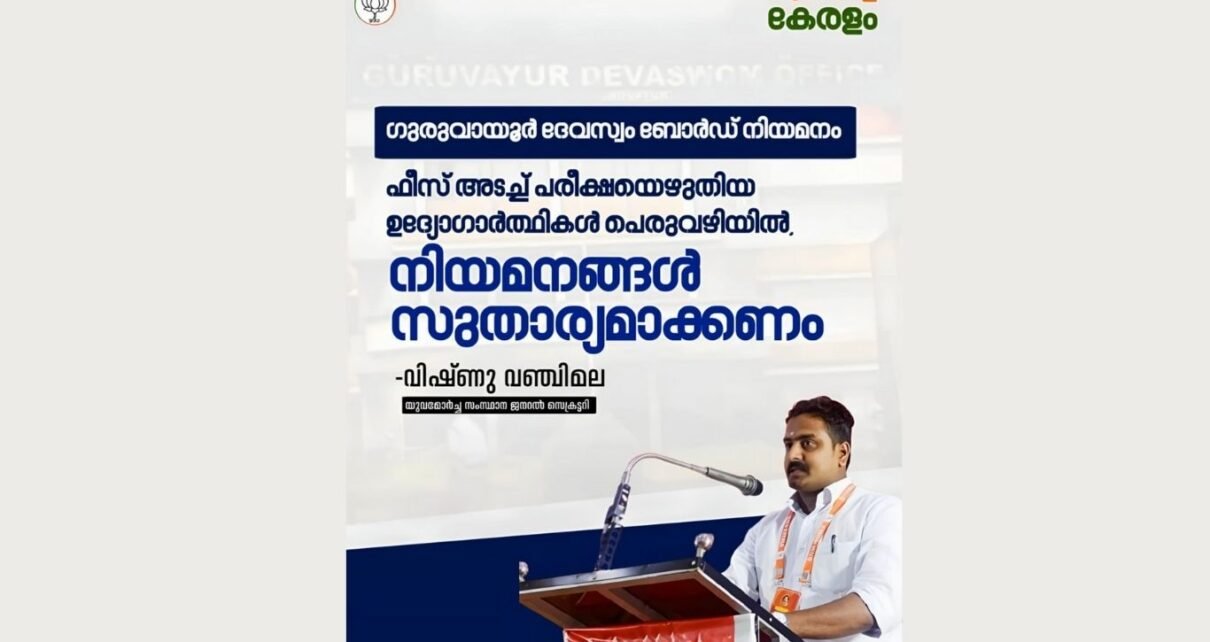 ഗുരുവായൂര്‍ ദേവസ്വം ബോര്‍ഡ് നിയമനം ;ഫീസ് അടച്ച് പരീക്ഷയെഴുതിയ ഉദ്യോഗാര്‍ത്ഥികള്‍ പെരുവഴിയില്‍, നിയമനങ്ങള്‍ സുതാര്യമാക്കണം: വിഷ്ണു വഞ്ചിമല