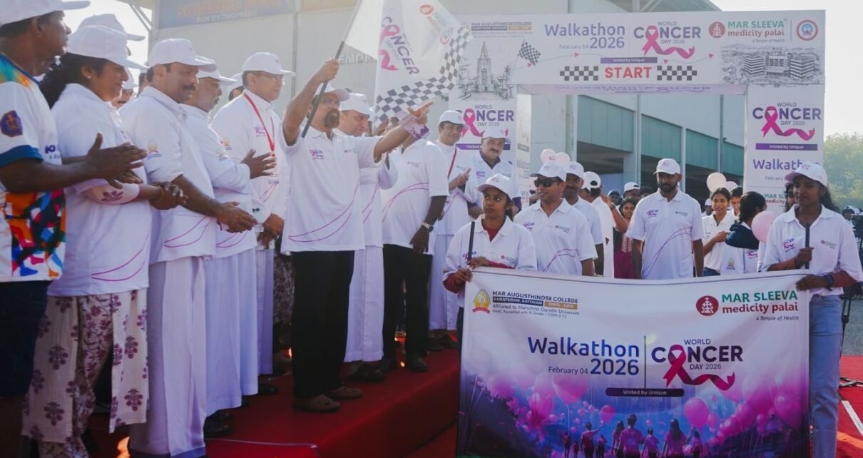 പാലാ : ലോക കാൻസർ ദിനത്തോട് അനുബന്ധിച്ച് മാർ സ്ലീവാ മെഡിസിറ്റി പാലായുടെ മാർ സ്ലീവാ കാൻസർ കെയർ ആൻഡ് റിസർച്ച് സെന്ററും രാമപുരം മാർ അഗസ്തിനോസ് കോളജും ചേർന്ന് ബോധവൽക്കരണ സന്ദേശവുമായി നടത്തിയ വാക്കത്തോൺ – 2026 വർണാഭമായി മാറി.